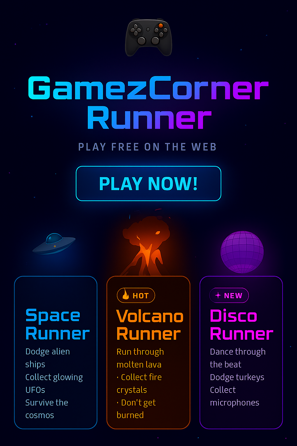 GamezCorner Runner ๐โโ๏ธ๐จ Pick your theme, then dodge obstacles and chase the highest score! ๐ฎ๐ฅ